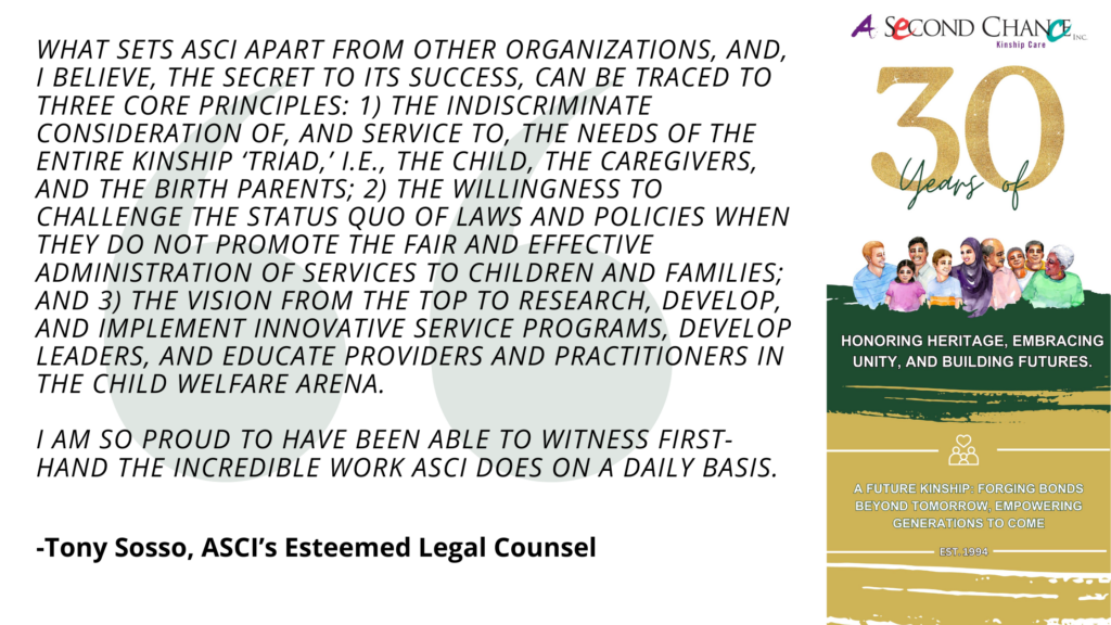 As we reflect on the past 30 years, we celebrate the profound impact of ASCI staff, supporters, and Dr. McDaniel’s unwavering commitment to the kinship triad. The journey from Highland Avenue to our regional offices in Philadelphia and New Hampshire, along with our national engagement, is a testament to the power of kinship care and the positive change it brings to families and communities across the nation.