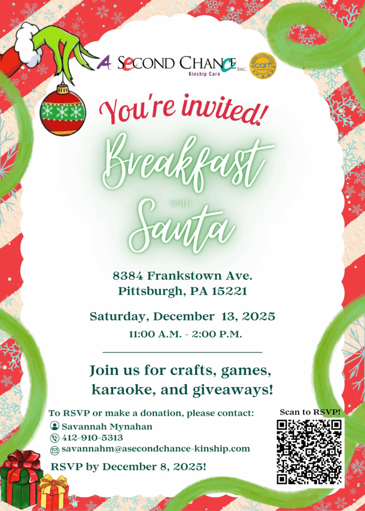The holiday season is here, and A Second Chance, Inc. is excited to invite our caregivers and community members to a joyful Breakfast with Santa! This festive event is all about celebrating kinship, connection, and holiday cheer.